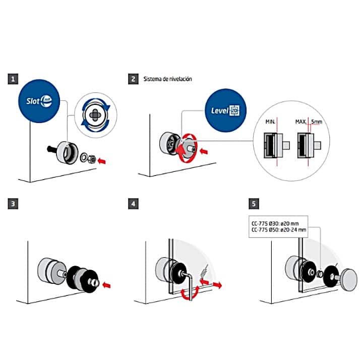 Soporte Botón para Sujeción de Cristal/Vidrio Lateral. Incorpora los dispositivos de nivelación Slot 360º y Level 2D que permiten una perfecta nivelación con el vidrio instalado.