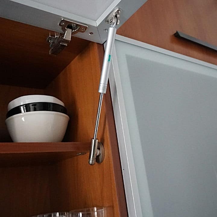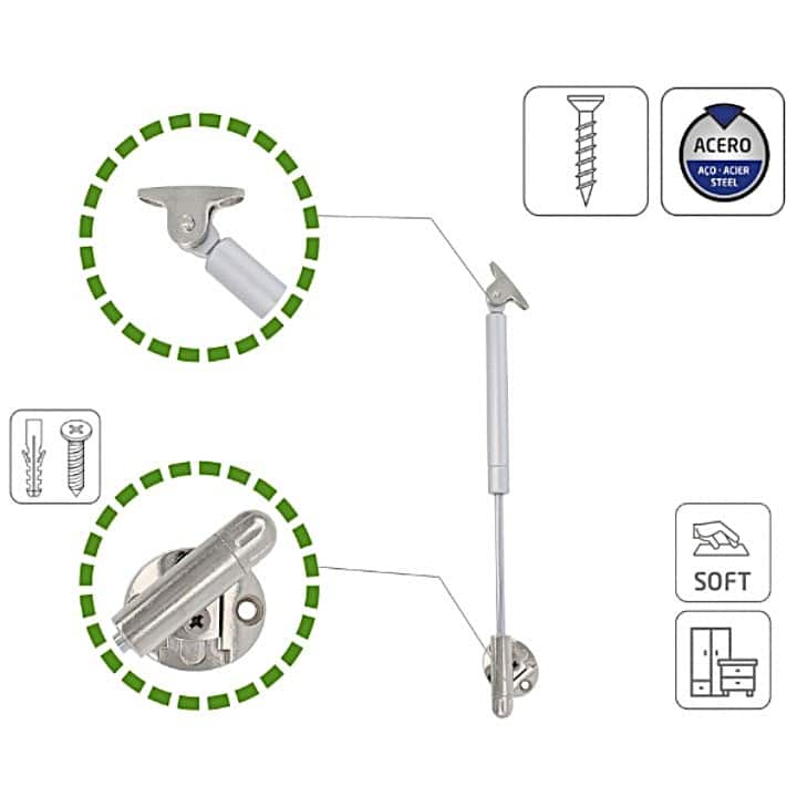 Compás de gas regulable para puertas abatibles de apertura ascendente.