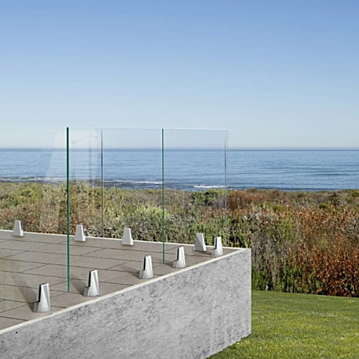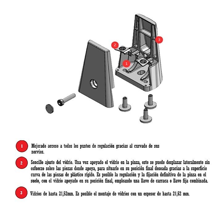 Soporte/Pinza de suelo para Sujeción de Cristal/Vidrio. Incorpora el dispositivo Level 3D que permite salvar irregularidades del forjado manteniendo la estética minimalista y mínimo impacto visual.