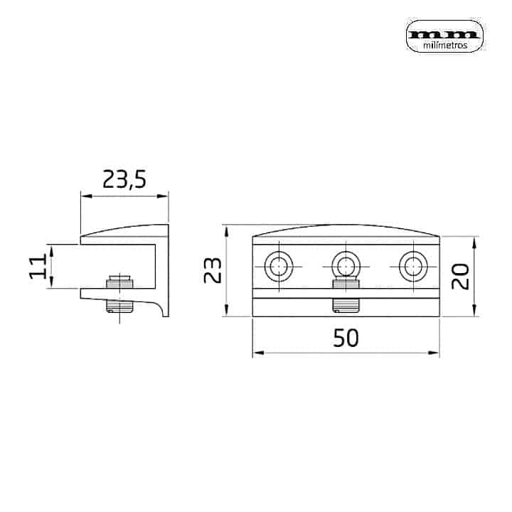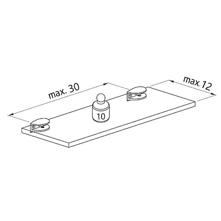 -Material: Zamak. -Acabado: Cromado. -Medidas: 23,5X50mm. -Peso máximo recomendado: 10Kg (Ver imagen). -Recomendación: Largo: 30mm o inferior – Ancho:12mm o inferior. -Incluye 1 Soporte + tacos + Tornillos.