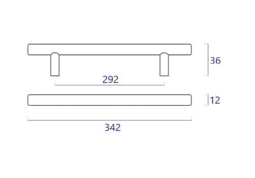 -Material: Acero Inoxidable. -Acabado: Inox satinado. -Medidas: 292mm (distancia entre ejes). -Largo: 342mm -Fondo: 36mm. -Diámetro: Ø12mm -Incluye 1 Tirador.