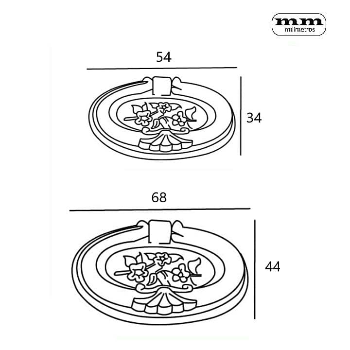 -Material: Zamak. -Acabado: Cuero Viejo. -Medidas: 54x34mm / 68x44mm. -Incluye 1 Tirador.