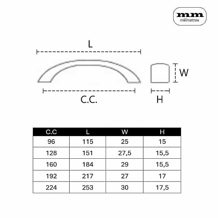 -Material: Zamak. -Acabado: Níquel Satinado. -Medidas: 96mm / 128mm / 160mm / 192mm / 224mm. -Instalación: Con tornillos pasantes. -Incluye 1 Pomo + Tornillos pasantes.