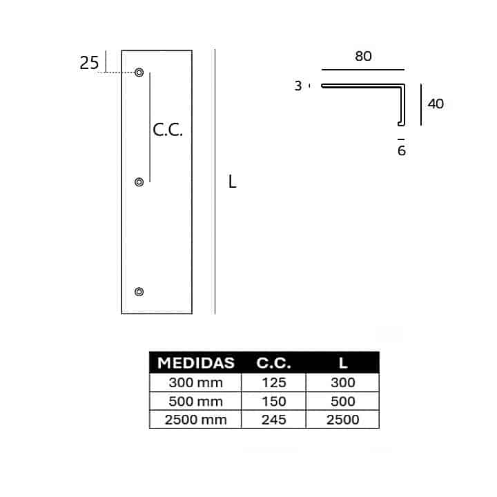 -Material: Aluminio. -Acabado: Negro RAL 9005 -Medidas (Largo): 300mm / 500mm / 2500mm. -Fondo: 80mm. -Instalación: Mediante tornillos. -Incluye 1 Tirador + Tornillos de sujeción.