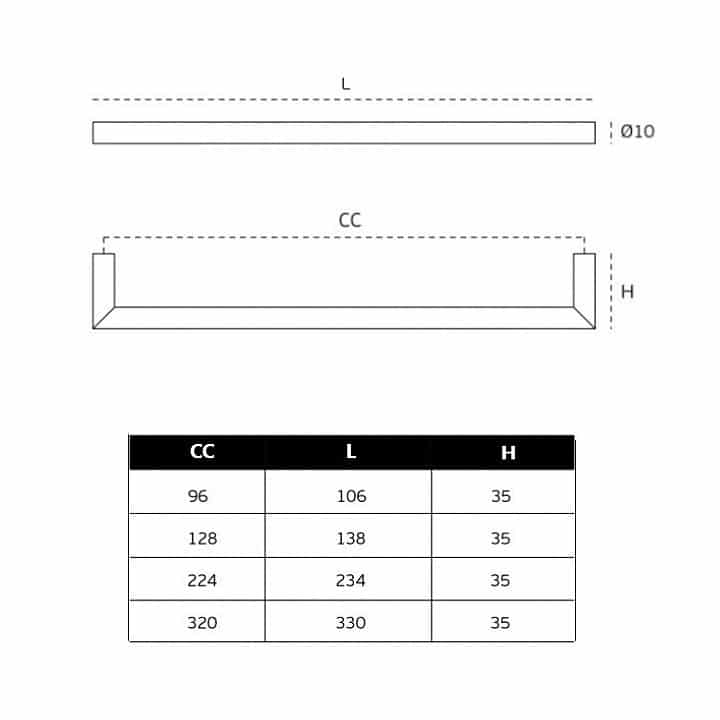 -Material: Acero Inoxidable AISI 304. -Acabado: Satinado. -Medidas (distancia entre ejes): 96mm / 224mm / 320mm. -Diámetro de Ø10mm. -Fondo de 35mm. -Incluye 1 tirador + Tornillos de sujeción.