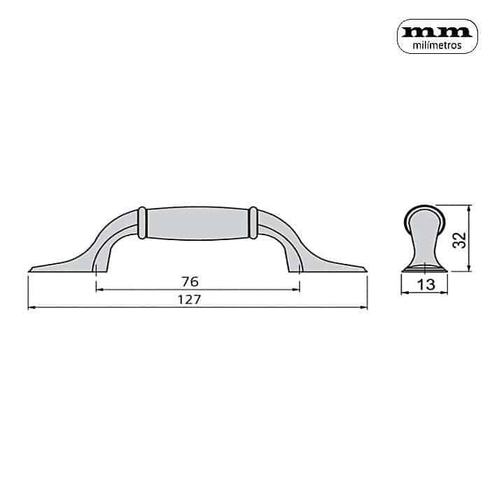 -Material: Zamak y Cerámica. -Acabados: Plata Antigua / Bronce. -Largo: 127mm. -Distancia entre ejes: 76mm. -Incluye 1 Tirador + Tornillos.